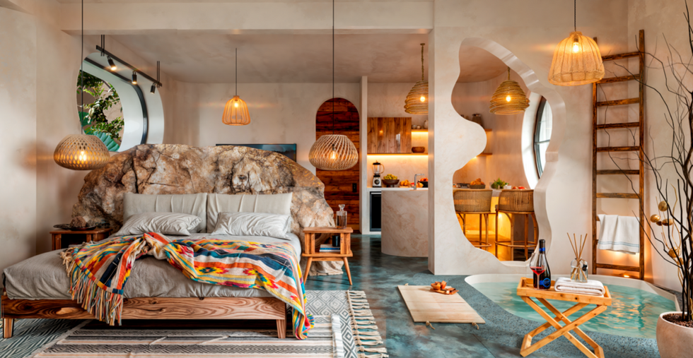 These units go beyond the typical studio experience, incorporating distinctive design elements such as a striking unique headboard, exquisite Oaxacan craftsmanship in the flooring, textured walls, and carefully designed windows that capture sunlight throughout the day.